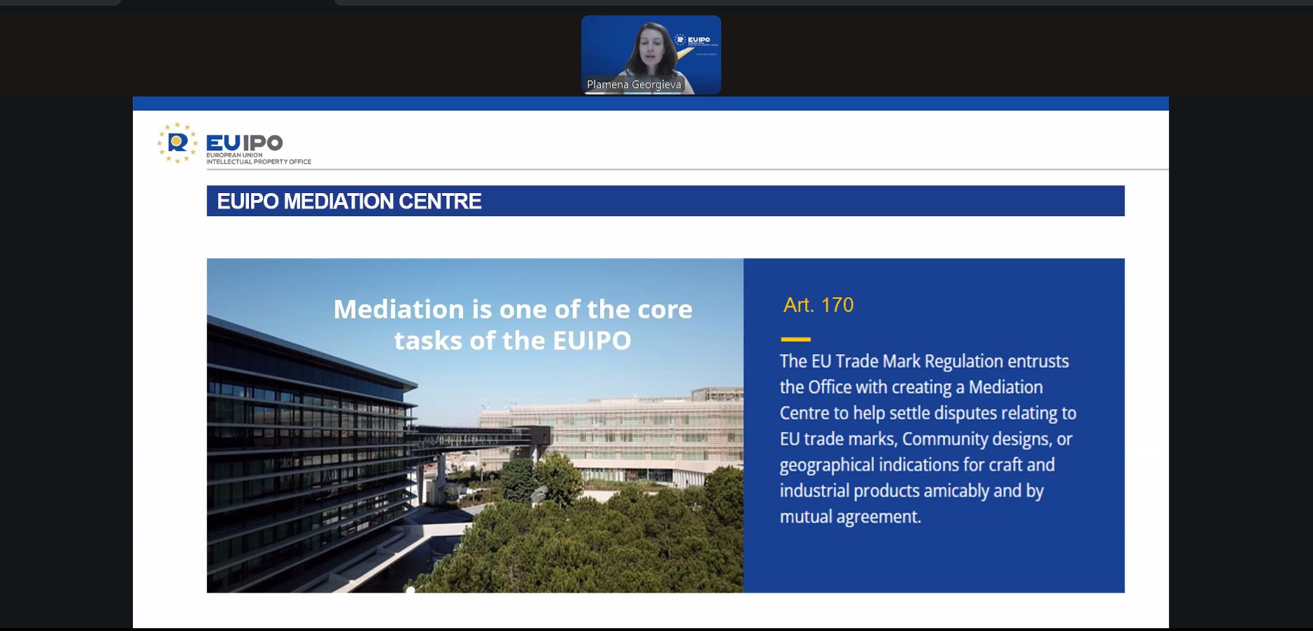 Plamena Georgieva, IP Lawyer and Mediator at the EUIPO Boards of Appeal, presented the services offered by the EUIPO Mediation Centre, outlined the circumstances in which mediation can be most beneficial, and showcased its advantages for businesses navigating complex IP disputes.